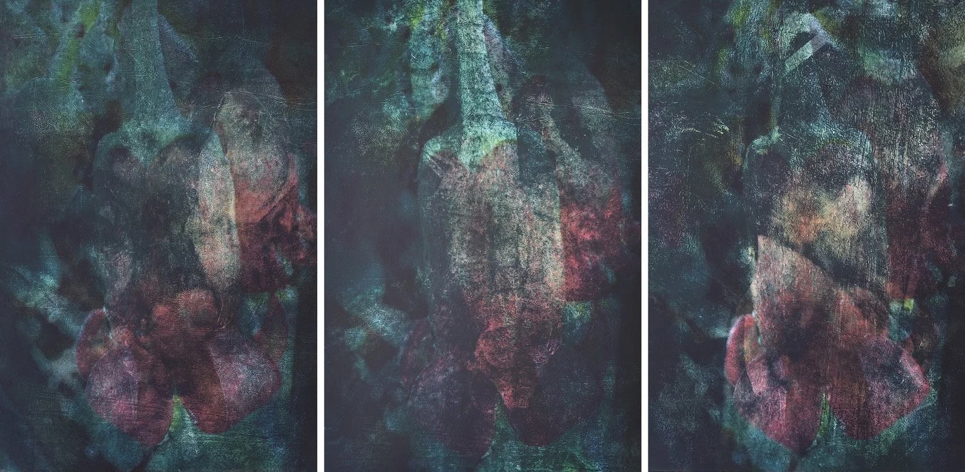 The photogravure key plates are composed of photographic imagery of foliage abstracted through painted layers, these are matched with close-cropped macro photography of urban gardens for the underpinning colour prints. The images are at once the product of daily walks, the experience of seasonal change – the everyday – as well as the imagined possible of what eco-philosopher Timothy Morton (2016) has called the ‘strange strangeness’ of perception in the age of the Anthropocene. Any gifted sense of our shimmering world and its possibles is now complicated by the reality of a permanent alteration in the biosphere. This new ‘dark ecology,’ to use another of Morton’s phrases, brings wonder with grief.
